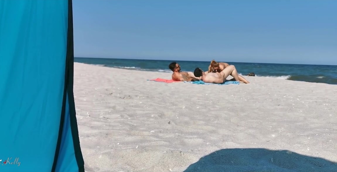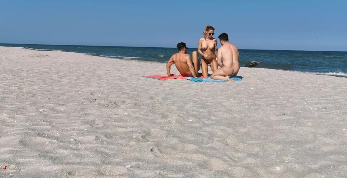 Два парня и девушка устроили групповой секс на нудистском пляже